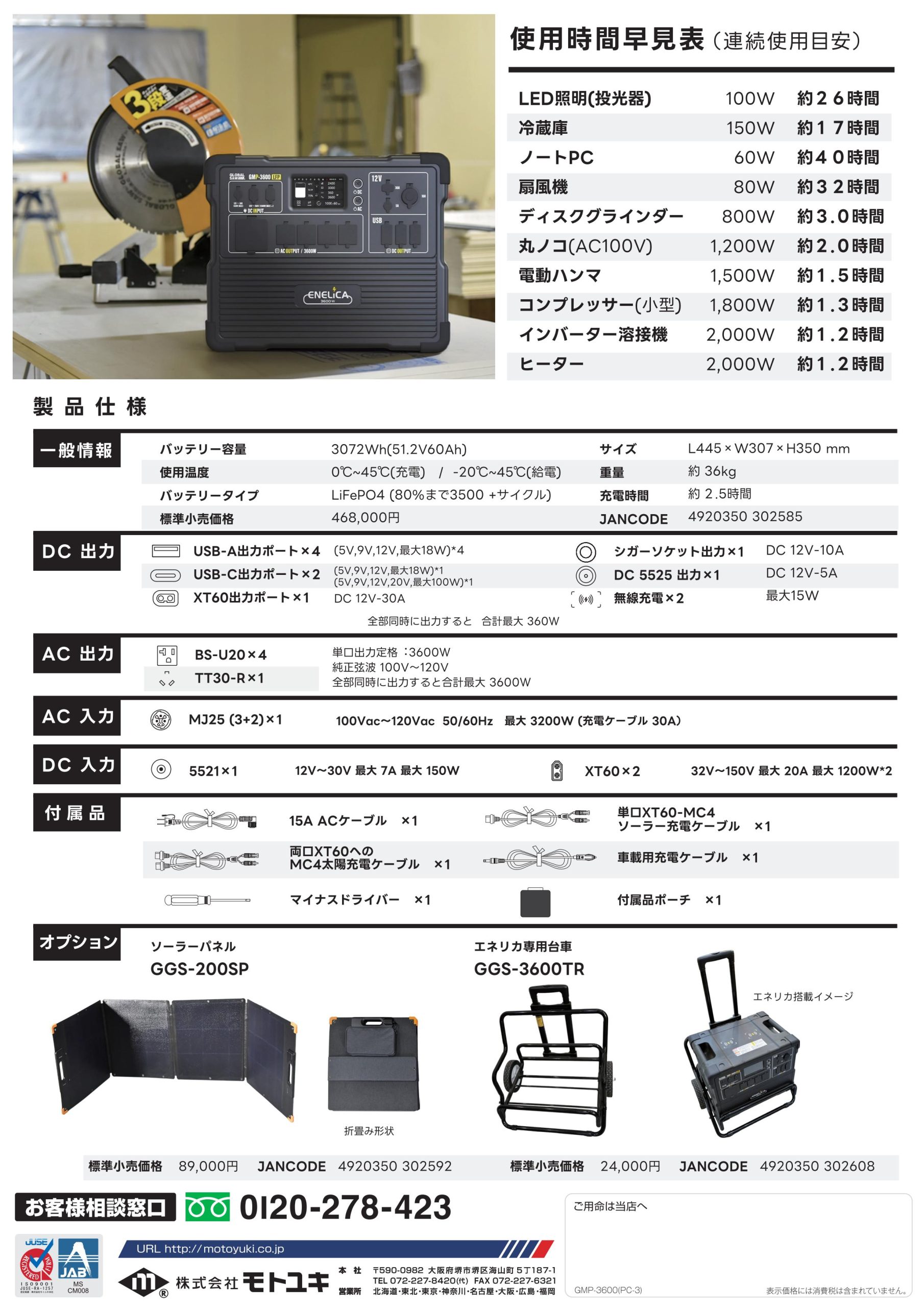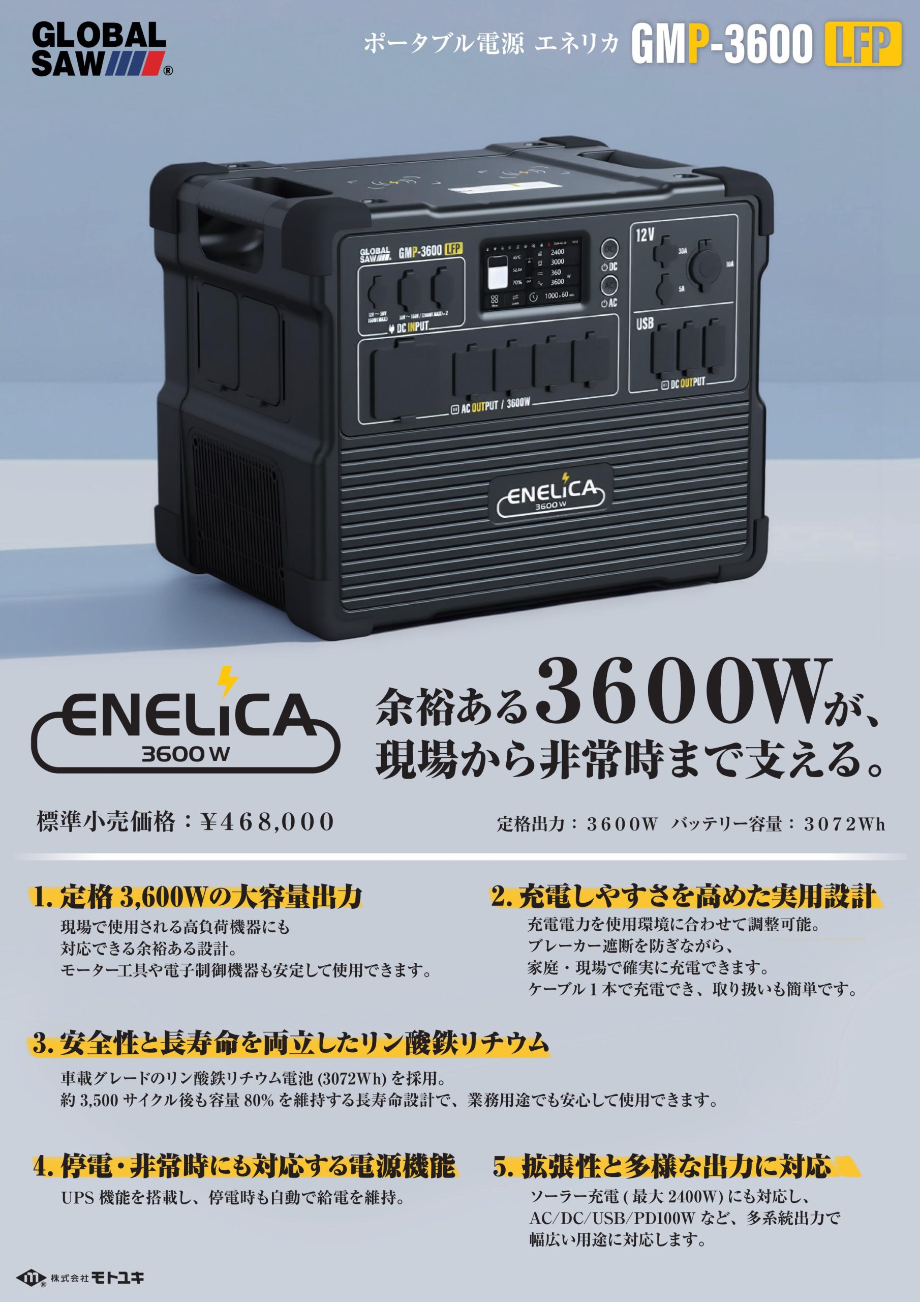 最大3600Wの高出力で、現場作業から災害時の電源確保まで幅広く活躍します。